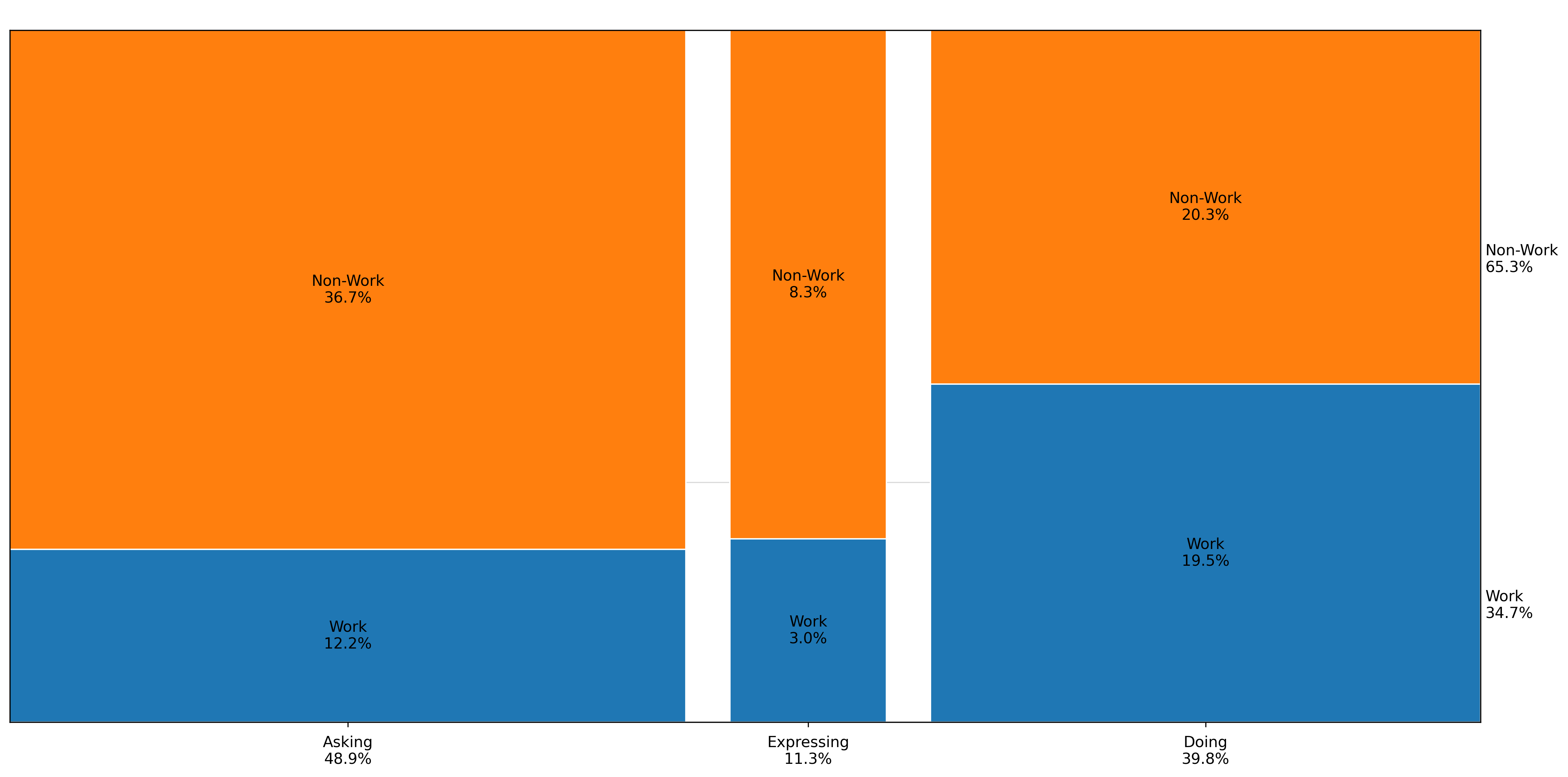 我们引入了一个新的分类法,根据用户寻求的输出类型对消息进行分类,使用一个简单的标准,我们称之为询问、执行或表达。询问是指用户寻求信息或澄清以告知决策,对应于知识工作的问题解决模型(例如,Garicano (2000); Garicano and Rossi-Hansberg (2006); Carnehl and Schneider (2025); Ide and Talamas (2025))。执行是指用户想要产生某种输出