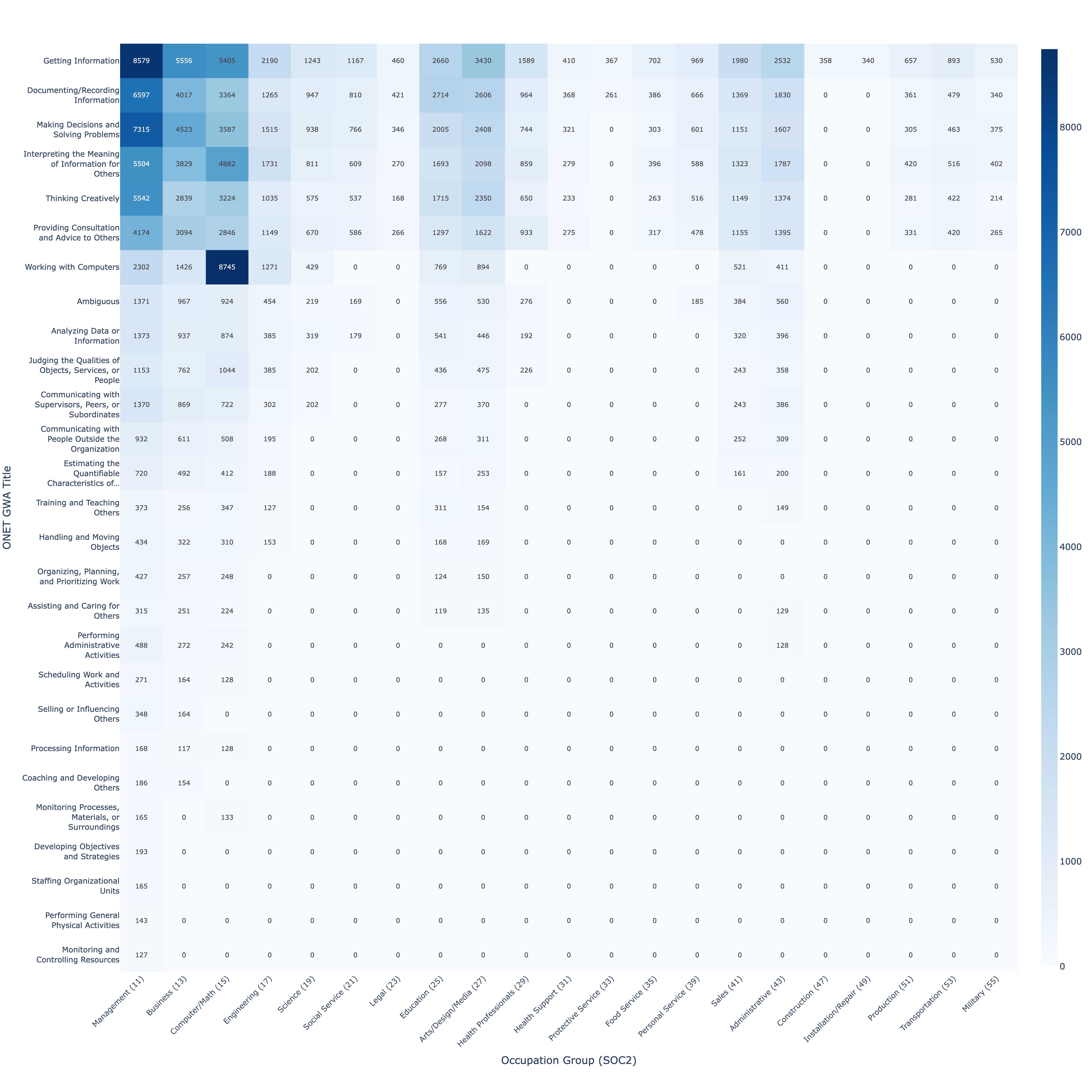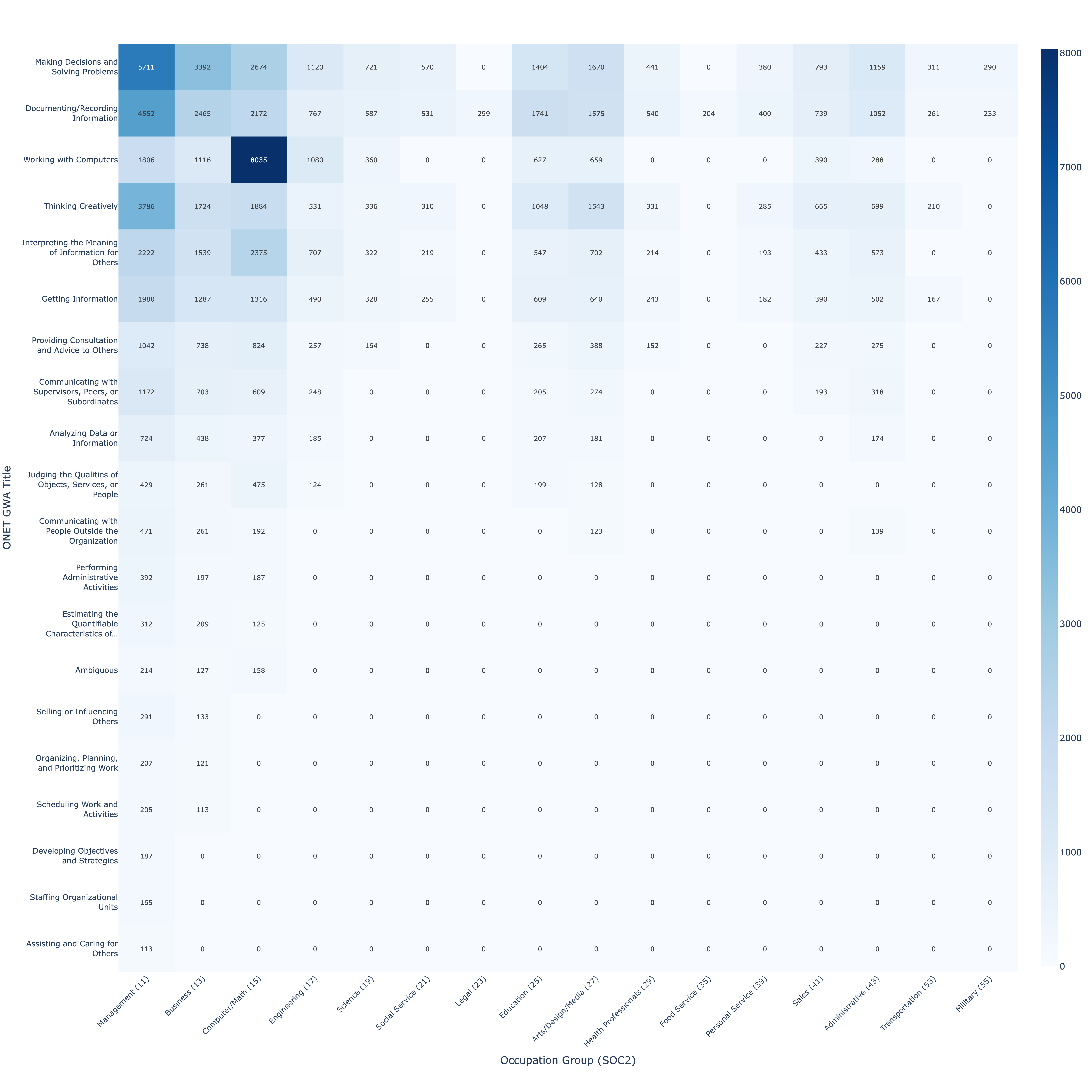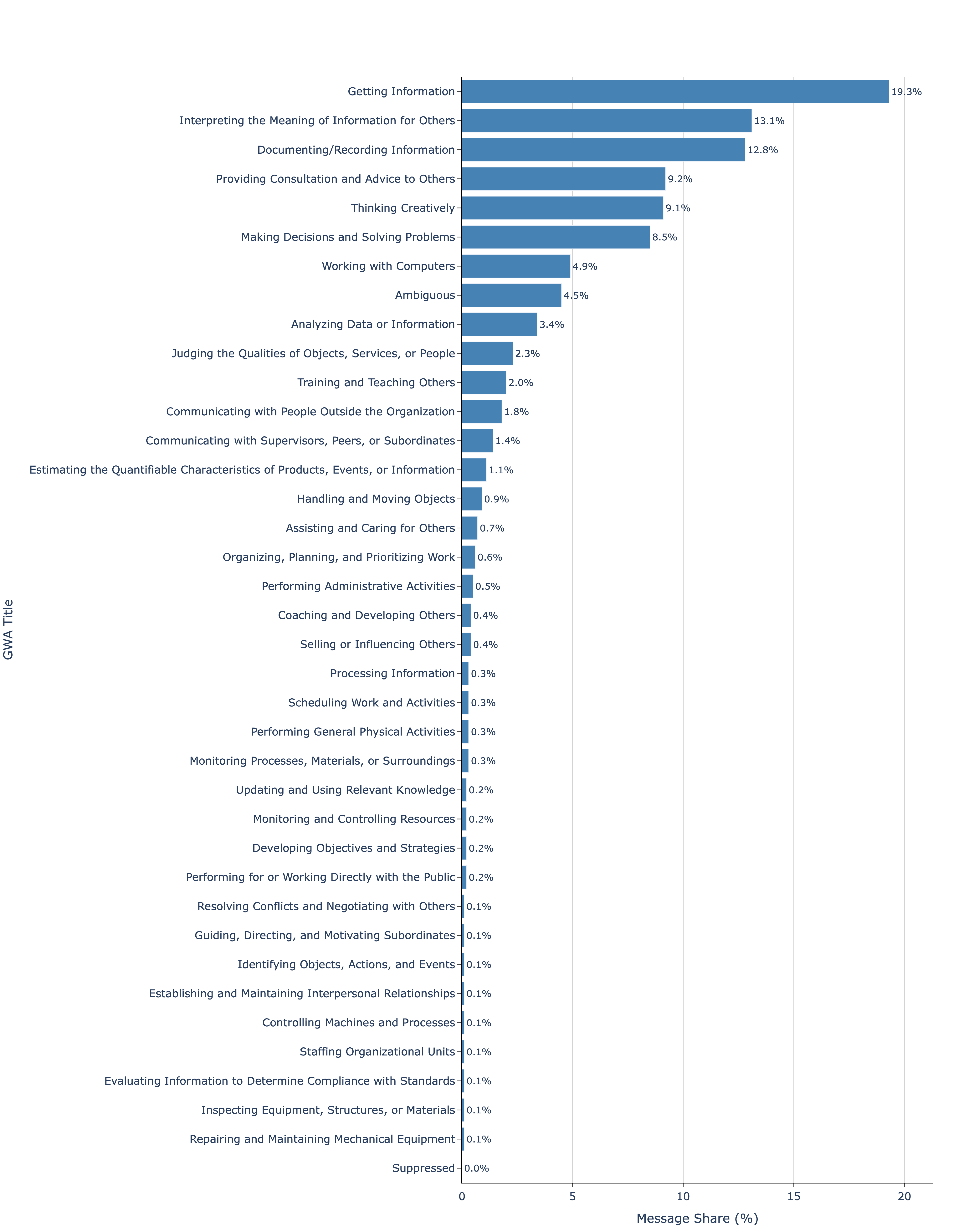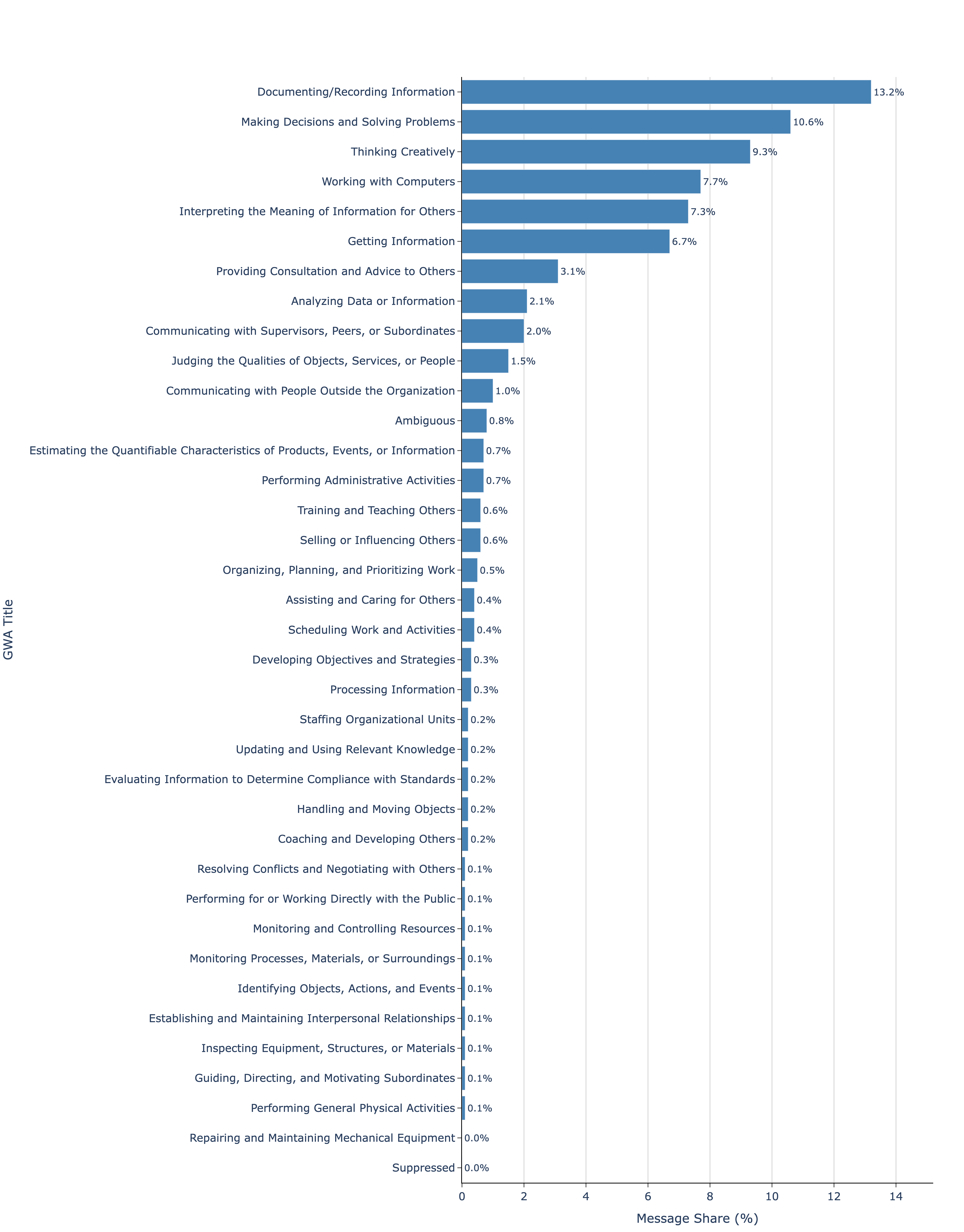 我们还使用职业信息网络(O*NET)将消息内容映射到工作活动,这是一个由美国劳工部支持的工作特征调查。我们发现,大约58%的工作相关消息与两个主要工作活动相关:1)获取、记录和解释信息;2)做决策、提供建议、解决问题和创造性思考。此外,我们发现与ChatGPT使用相关的工作活动在截然不同的职业类型中高度相似。例如,获取信息和做决策解决问题这些工作活动在几乎所有职业的消息频率中都排在前五位,从管理和商业到STEM到行政和销售职业都是如此。