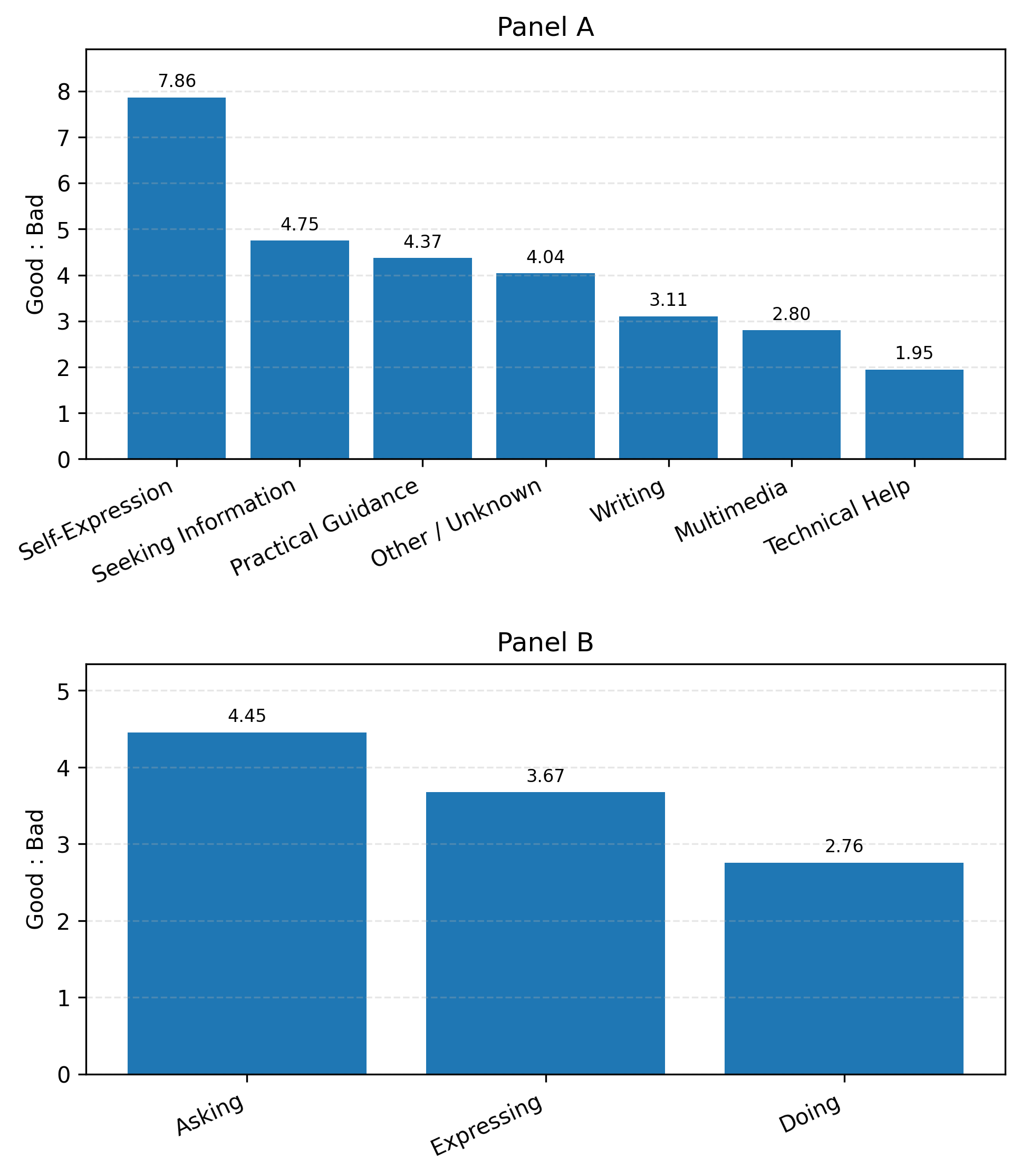 ChatGPT如何提供经济价值,以及对谁的价值最大?我们认为ChatGPT可能通过提供决策支持来改善工作者产出,这在知识密集型工作中尤为重要,因为更好的决策制定会提高生产力(Deming,2021年;Caplin等人,2023年)。这解释了为什么询问对于在高薪专业职业中就业的受过教育的用户相对更常见。我们的发现最符合Ide和Talamas(2025年)的观点,他们开发了一个模型,其中AI智能体可以作为产生输出的同事或作为提供建议并改善人类问题解决生产力的副驾驶。