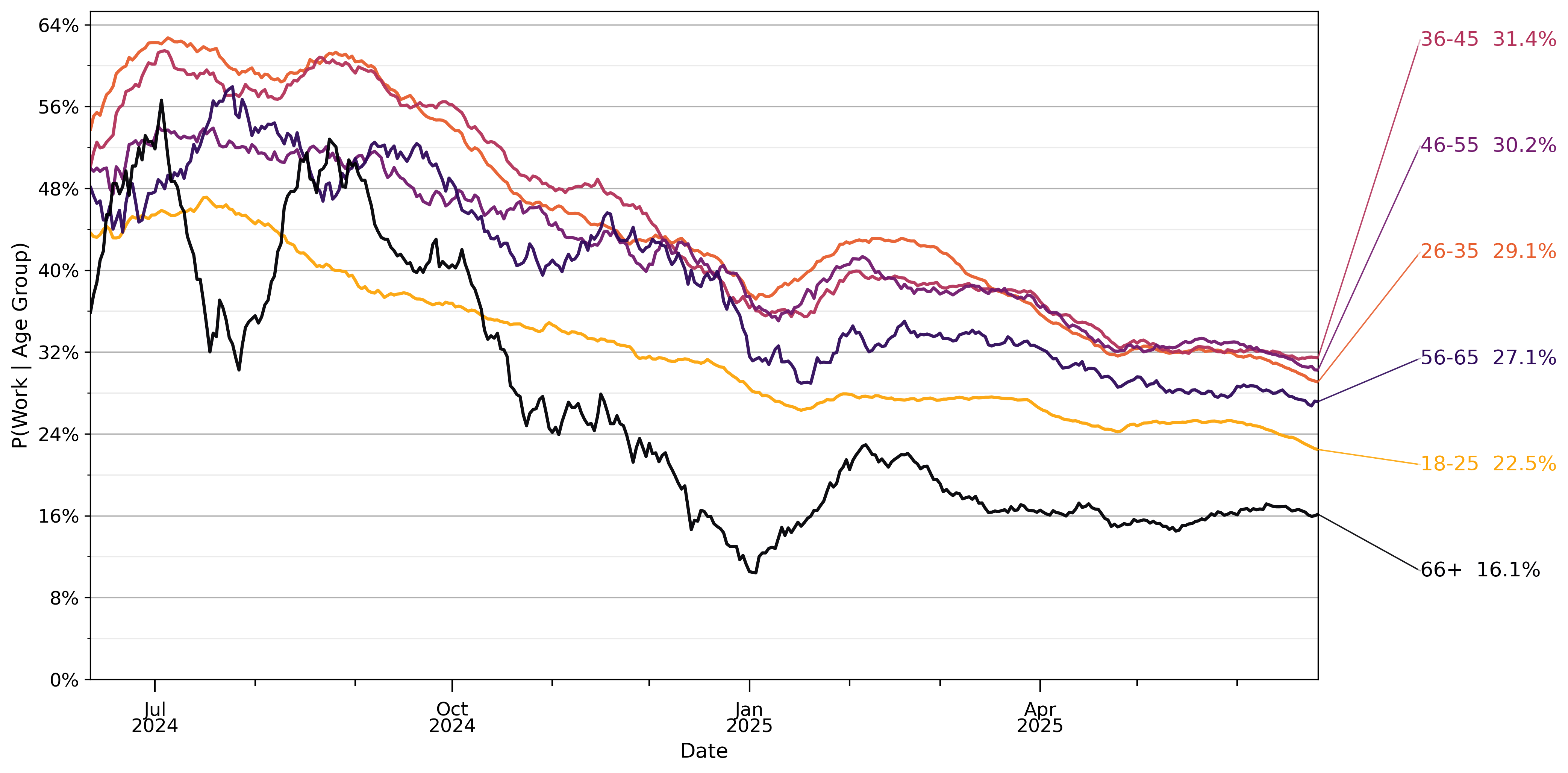 表1:ChatGPT日消息计数(百万),按可能与工作相关或非工作相关进行分类。日总计数是所有消费者计划消息量的精确测量。工作和非工作相关消息的日计数是通过对当天随机抽样对话进行分类估算的。抽样会排除选择不分享其消息用于模型训练的用户、自报年龄低于18岁的用户、未登录用户、已删除的对话以及已停用或禁用的账户(详细信息见第3节)。报告的数值是7天平均值(以平滑每周波动),截止日期分别为2024年6月26日和2025年6月26日。