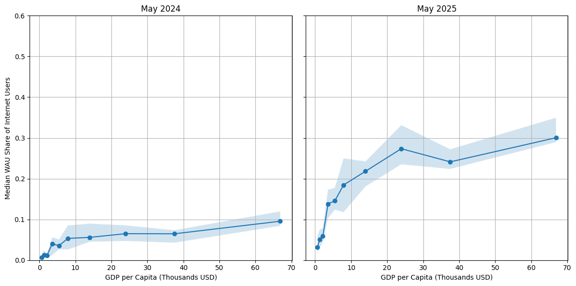 ChatGPT于2022年11月30日作为”研究预览版”向公众发布,到12月5日已有超过一百万注册用户。图[3]报告了消费者计划上总体周活跃用户(WAU)随时间的增长情况。ChatGPT在一年后拥有超过1亿登录WAU,两年后接近3.5亿。到2025年7月底,ChatGPT拥有超过7亿总WAU,接近世界成年人口的10%。[20]