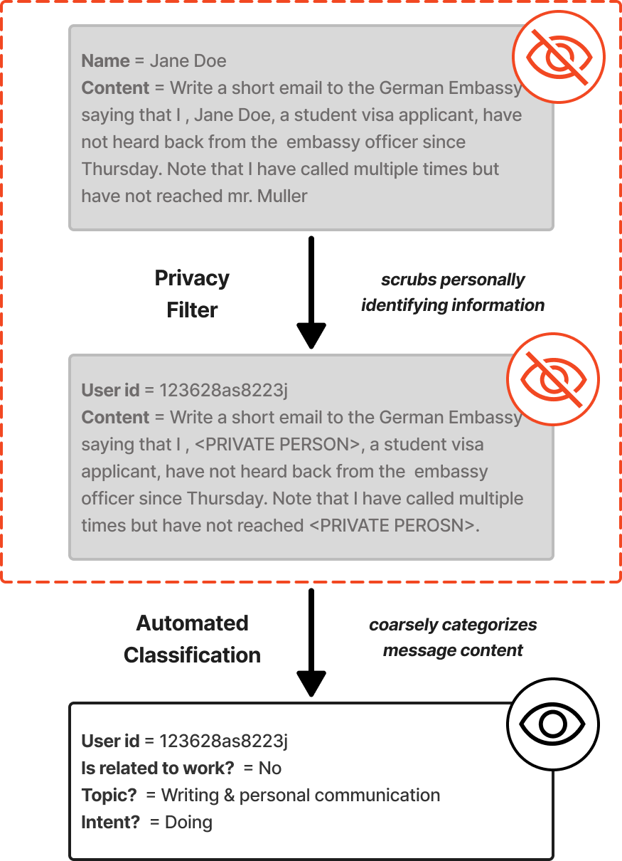 消息的自动化分类。在分析过程中,没有人直接查看用户消息的内容:我们对用户消息内容的所有分析都是通过在去标识化和个人身份信息(PII)清理的使用数据上运行的自动化分类器的输出完成的。