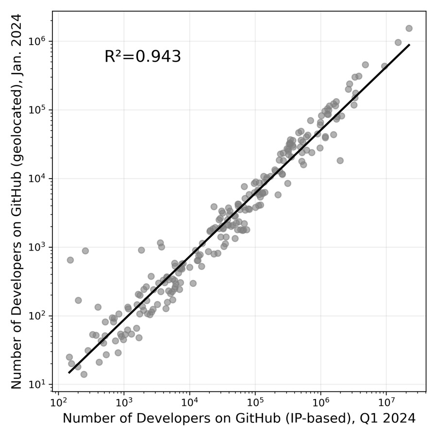 我们的数据收集过程如下。首先,我们使用托管在 Google BigQuery 上的 GHArchive 数据集收集所有在 GitHub 公共仓库(repositories)中提交过代码的用户,重点关注 2019-2024 年期间。然后,我们使用通过 GraphQL API [[47]] 从 GitHub 个人资料中获取的自报位置对 GitHub 用户进行地理定位(geolocate)。补充材料(SI)的图 [S1] 显示,从自报数据得出的用户跨国家分布与 GitHub Innovation Graph 数据集 (https://innovationgraph.github.com/) 提供的基于用户 IP 地址得出的分布非常接近。