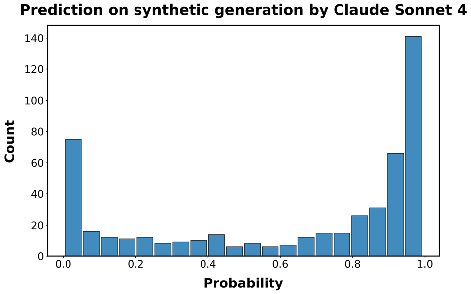 在每个轮次(epoch)中。最终,只保留在评估集上表现最好的模型。为了可重复性(reproducibility),我们使用固定的数据种子(seed 365)。如图S2所示,该模型能够有效识别我们真实数据中的AI生成代码,达到样本外ROC AUC得分0.96,平均精度得分(Average Precision Score)[52]为0.9685,平均真阳性率(true positive rate)为0.95(F1得分0.8911,阈值为0.5)。