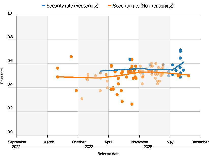 我们观察到大语言模型安全性呈略微上升趋势,这完全是由OpenAI最新的推理模型推动的。非OpenAI模型的表现与其之前版本相比保持不变。